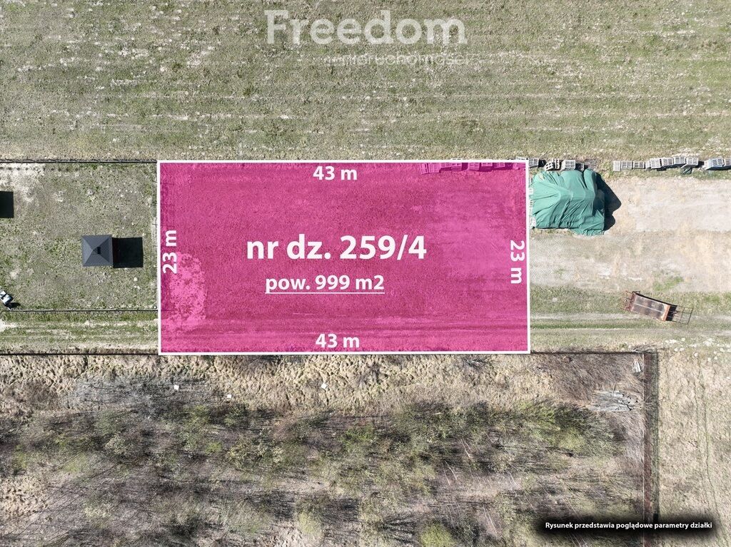 · Powierzchnia: 1000 m², o wymiarach około 23 m x 43 m (nr działki